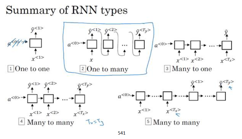 我们现在看到的RNN结构中 输出尺寸 TxT_x 等于 输出尺寸 TyT_y, 然而当他们不相等时,RNN结构要做出改变