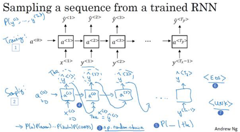 1. 输入 𝑥<1>=0𝑥^{<1>}=0𝑎<0>=0𝑎^{<0>}=0,在第一个时间步经过 softmax层 后输出各个词的概率向量,在这个向量中随机采样作为 y<1>y^{<1>}
