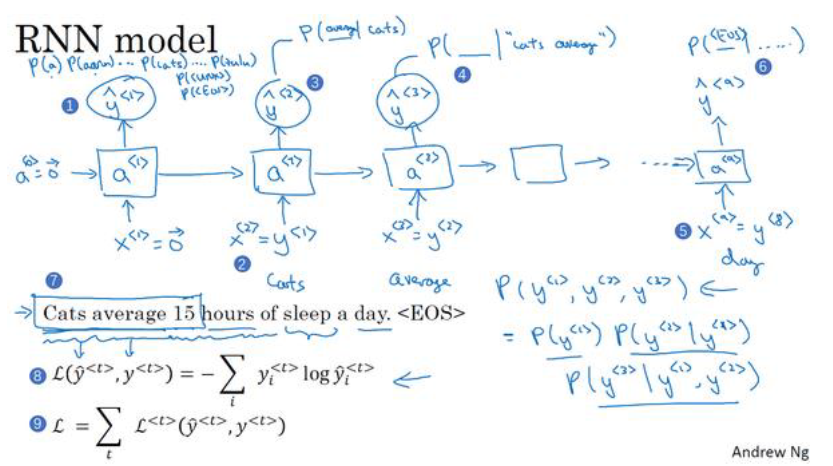 L=tL<t>(y^<t>,y<t>)L = \sum_{t} L^{<t>}(\hat{y}^{<t>}, y^{<t>})
