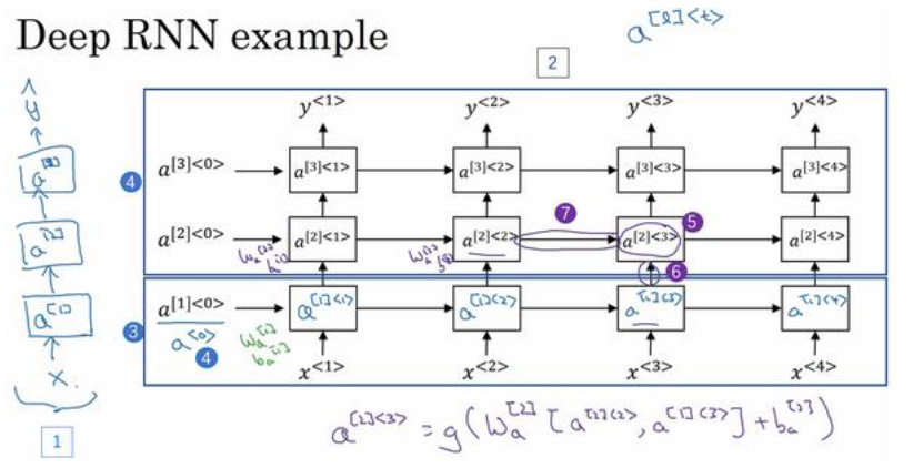 a[2]<3>=g(Wa[2][a[2]<2>,a[1]<3>]+ba[2])a^{[2]<3>} = g\left(W_a^{[2]} [a^{[2]<2>}, a^{[1]<3>}] + b_a^{[2]}\right)