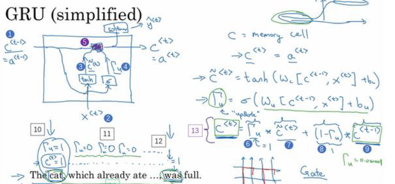 GRU中还有一个叫“门”的结构 Γu,Γr(0,1)\Gamma_u,\Gamma_r \in (0,1), 下标u代表更新门,下标r代表相关性。