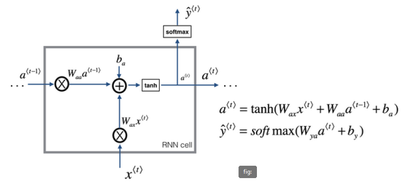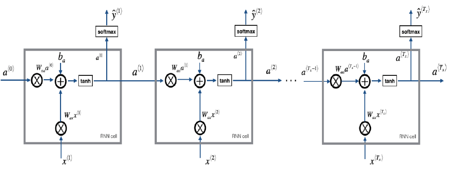a<t>=g1(Waaa<t1>+Waxx<t>+ba)a^{<t>} = g_1(W_{aa} a^{<t-1>} + W_{ax} x^{<t>} + b_a) y^<t>=g2(Wyaa<t>+by)\hat{y}^{<t>} = g_2(W_{ya} a^{<t>} + b_y)